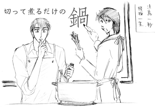 | 「本日は皆さんのレベルを考慮して最善の献立を用意いたしました! 講師の武津です、よろしくお願いします」 「同じく 義武です。 では、本日の手順を説明しますので、よく聞いてください。 材料を 切って 煮て 食べます」 |
