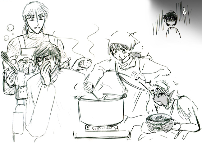 晶「任せとけ!」 シアン「晶、料理したことあるの?」 晶「ない!」 吏兎「ねー、これ入れてもいい?」 晶「おーどんどん行こうぜ〜!」 暁龍「……………」 義武「……で、では始めて下さい」 |